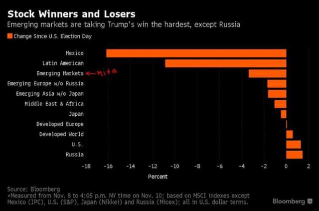 Menggunakan MSCI, kita boleh dapati selain daripada negara Latin dan Mexico, negara yang terkesan daripada kemenangan Trump adalah emerging markets yang termasuklah Malaysia.